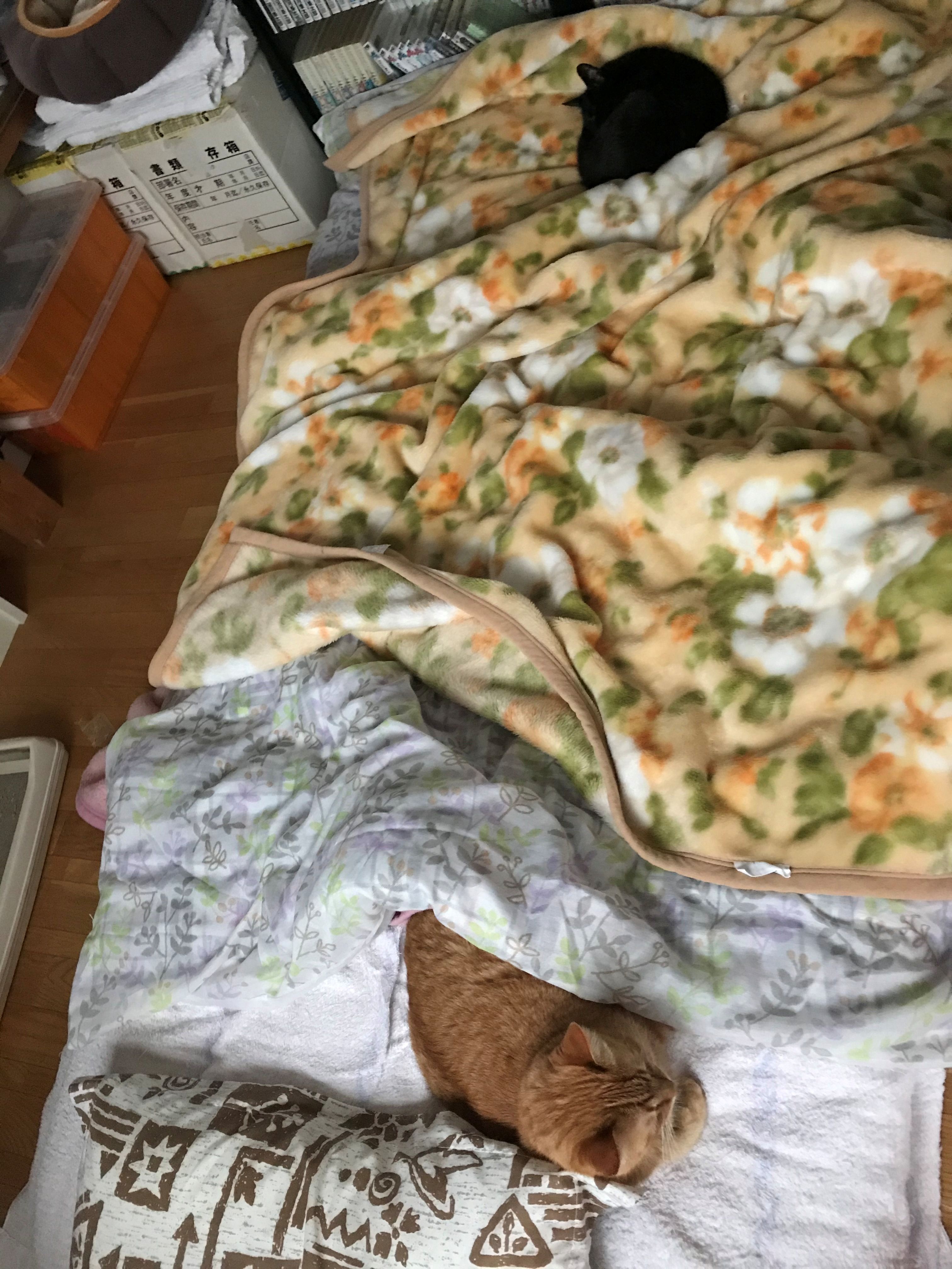 昼は良いとしても、朝夕は肌寒いので 一緒に寝てる野分(♀8歳)と黄縞さん(♂8歳) でも、野分の表情が、嫌そうな気がします。 ほら、やっぱり〜 嫌〜〜 と言ってる感じがしますよ黄縞さん。 黄縞さんは、大丈夫そうにしてるけど、 野分は、完全に「嫌〜〜」って言ってます。 うちのニャンズは、くっついて寝るのは苦手らしので、 よほど寒くないと、この2猫でも無理みたいです。