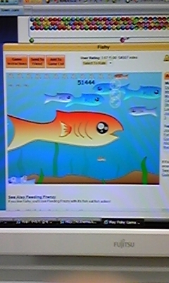 http://www.arcadetown.com/fishy/playgame.asp↑このゲーム、結構ハマります。水槽の中で、自分の魚を上下左右に動かし、魚を食べて大きく成長させるゲーム。ルールはただ一つ。「自分より小さい魚しか食べられない」ということです。大きい魚に触れたら食べられて死んでしまいます。そして、この魚、一匹食べるごとに「ゲー!」とゲップをします。ああ、お下品。どんどん、どんどん、食べれば食べるほど大きくなります。が、必ず途中で食べられてしまっていました。ところが・・・今日は最後までクリアしてしまいました。最後は画面いっぱいにデカくなるお魚ちゃん・・・そして、しまいには「あなたはすべてを食べつくしてしまい、池の生態系を破壊してしまいました」というメッセージが・・・あら、てっきり水槽だとばかり思っていたのは、池(ポンド)だったのですね・・・。結構ハマります。お暇な方だけどうぞ! リンク先のURLは、最初は別のゲーム画像のようなものが表示されますがしばらく経てばFishyゲームが再生されます。