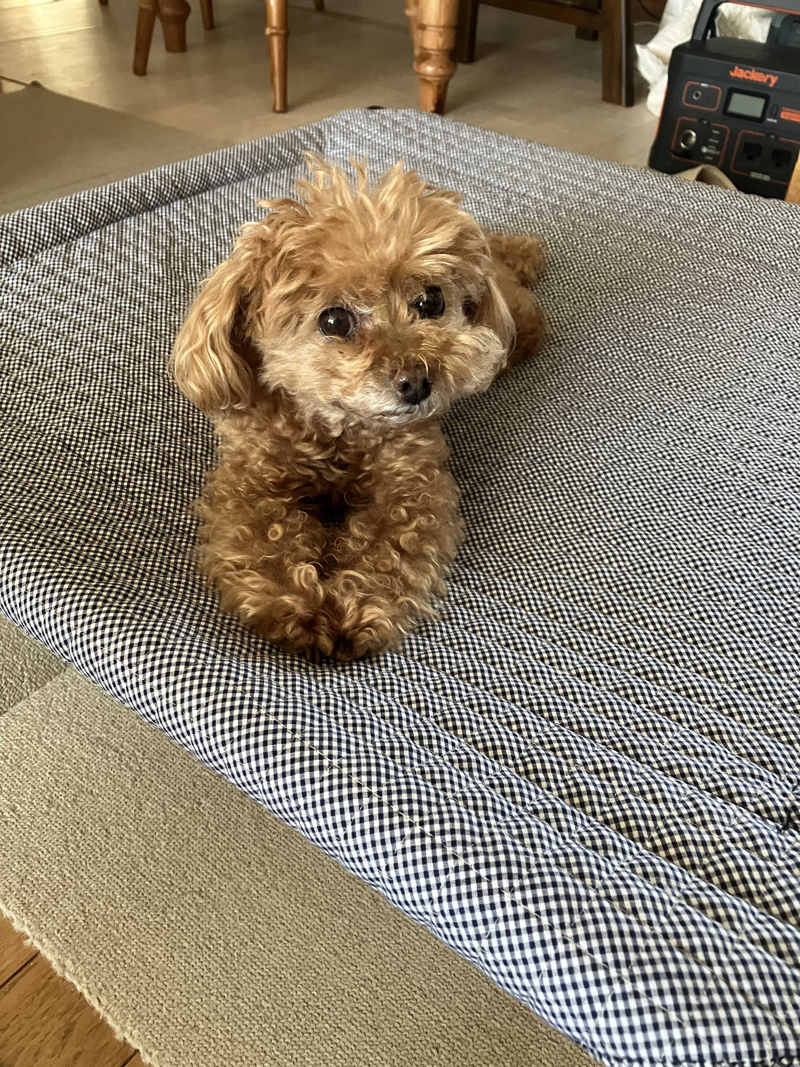 この前 キャンプ場に行った時 むぎちゃんは専用のイスでまったりしていたんですが