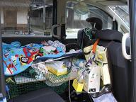 さっきアップするのを忘れてました^^;ちょっとごちゃごちゃして見えますが、セレナの車内です。運転席のうしろには、いろいろ入るたまひよの車用のやつ。(何ていうのかな?)その上に、吸引機をカラビナでひっかけてます。(カラビナ・・・登山用の道具で、何かと重宝します)のぞたんの頭の上には専用せんぷうき。ベットの下は、モノ置き場所。タオル、おむつ、ティッシュ、もろもろ。緑のネットが見えますが、このネット、ベットの向こう側にもあって、これをのぞたんのおなかの上でカラビナでひっかけ、「のぞたん用シートベルト」のできあがり~^^ベットの下は、白いマットとか板とか、いろいろひいてます。