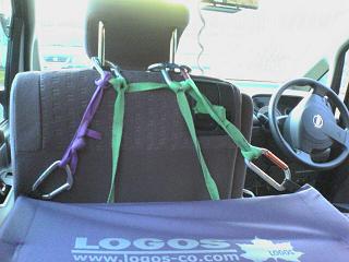 板の固定は、下の写真の真ん中の2本の緑のヒモで、助手席から吊り下げています。