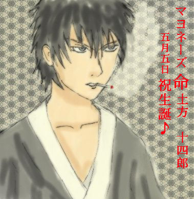 本日は銀魂のキャラ真撰組の副長?で良かったですよね。マヨネーズ命、マヨラーの土方十四郎のお誕生日です♪銀魂暦が浅いのと、空知先生の絵が上手く描けない!だから似てないかも・・。でも土方のキャラは好きだだからこのマヨ誕に参加しました♪本誌の方では今少々ヘタレ気味みたいですが・・。アニメでも本誌でもかっこいいとこ見せて欲しいですね。土方十四郎ハピバまだ旦那さん実家なので、ツアー巡回は後ほどゆるりと周ります♪マヨ誕ツアー お次はこちら!