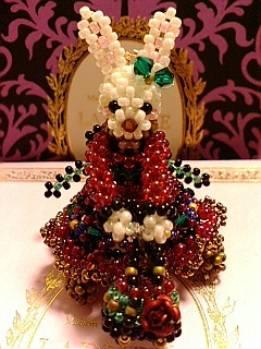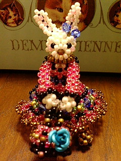 オレンジうさぎできました~。かわゆかー!めっちゃかわいい!母上に写メ送ったらご満悦でした。よかったよかった。あとはもうちょっとウエストとリボンの青を明るくして最終決定です。ヴィヴィアン・ウエストウッドのハンカチを見てこの配色を思いついたそうです。ヴィトンとティファニーとヴィヴィアンを愛する母。(以前、ヴィトンの携帯ストラップとコラボったうさぎを三種類作ったら、お礼にとアマゾンをくれました。縦長の肩掛けタイプ。むっちゃ頑丈で重宝しまくってます。感謝!)そして木村カエラと平山あやが好きです。なんともハイカラな!明日からは、これまた母が配色を考えたワインレッドのうさぎ製作です。FAXで届いた色合わせでスカートの模様を途中まで作ったら写メって、母のイメージ通りだったら作り進めるのです。ビーズは透明感があるぶん、色の配置や並ぶ個数によって色合いが全く変わってしまうのです。そこが面白くもあり難しくもあり。自分で考えた配色のうさぎを作るのももちろん楽しいですが、リクエストものは完成図の想像がつかないぶん楽しさもひとしおです。ブログを何度か見てくださっている方はお気づきかもしれませんが、私は淡い同系色で無難にまとめがちなのです。だから母の、補色を入れつつバランスを取る華やかな配色はとても刺激になるのです。私は、オレンジを見てかわいい色だなーと思ったけど、服のメイン色にもってくる勇気はなかったなー。(秋色うさぎの記事参照)しかもガツンと黒と合わせてくるとは。(私は茶色にしましたとも…。)今回ホントびっくりした。チカラワザなのにバランスとれててかわいい。母上ハンパねえー!加えて私は、母にオレンジ色の印象がある(母が身につける色でもないのに何故だろうか)ので、どうにもこのうさぎが母に見えてくるのです。心なしか顔まで似ている気がする…。顔の作り方は全部おんなじなのに。(笑)まさにコレははうさぎ。