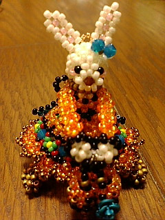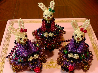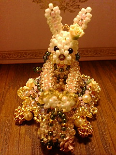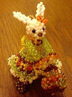 祝日に仕上げたうさぎちゃん。秋なので、思いっきり秋っぽい色合いにしてみました。母上に写メしたら『栗拾い~v』と言われました。そうそうそんな感じ。夏にオレンジ色のビーズに一目惚れして購入してから、緑や茶色と合わせて秋っぽくしたいなーと思ってたのがやっとできて満足です。今は、母から同じオレンジを使ったうさぎの色指定がFAXで届いたので、それにとりかかってます。(新しくビーズを買い足す度に、母に何粒か色見本として送っているのである)母はオレンジのビーズを見て、青と合わせたい!と思ったのだそうな。青は思いつかなかったな…。でもって実際に合わせてみたらめちゃくちゃ可愛いのです!母スゴイー!同じ色を見ても合わせ方が人によって全然違ってくるのが、ビーズのおもしろさだなあとつくづく思いました。母にもまだいくつかプランがあるみたいです。いやっほう!いつものことながら華やかなうさぎになりそうで、完成が楽しみです。今週中にできたらいいな~。