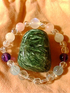 日曜日に、またもや千駄木から天然石を連れて帰ってしまいました。全員くまなく可愛がってあげられる限界をとうに越えているのに…。これがペットだったら、はたまた恋人だったらもう一大事です!(笑)中心にいる濃い緑色の石はセラフィナイトちゃんです。左っかわから羽根が生えているような模様にみえませんかー。その左側面を中心にして、放射線状に白い模様が広がっているのです。だから石の両面に翼が生えたように見えてむっちゃくちゃかわいい!カンペキ一目惚れでした。そのうえ手に乗せるとじわわわわーんとあったかい。ういやつめvv名前の由来もやはりその羽根のような模様からきています。宝冠のチャクラと第三の目に対応してるらしい…ってまたかい!私が好きになる石ってそんなんばっかしです。またかよと言わんばかりに石屋さん超苦笑い。そしてブレスはリニューアルものです。去年の夏に、たいへん疲れていたので応急処置としてブレスを作って頂いたのです。もう私の疲れはカンペキ癒えたのですが、かわりに石の方が疲れ果ててしまいまして。それで今回、土にかえす石とまだ頑張ってくれる石とに分けてもらって、新しい石と組み合わせて頂きました。<初代>ラピスラズリ琥珀アクアマリンエメラルドヒマラヤ水晶間に小さな水晶がたくさん。癒しと保護に特化したラインナップでした。特に、ラピスはもうすっかり淀んでしまっておりました。(涙)元気なものと比べてびっくり。今までほんとにありがとう!すっからかんになるまで吸い尽くしてごめん…。<二代目>(写真上から)ムーンストーンモルガナイトアゼツライトアメジストアクアマリンヒマラヤ水晶そして間に水晶。初代の生き残り4粒と、新入りのカット加工の子がいます。今回お見立てして頂いたら、かわいらしいラインナップになりました。最初はアゼツは入ってなかったので、ふんわかした癒しと女性性のブレスになるところでした。しかし、アゼツライト欲しいんですよねーと話してるときに、ブレス用ならあるとのことで急遽組み込んでもらいました!(ホントは透明な原石が欲しかったのですが、とにかく数が少ないらしいです)これで突然パワフル系に。拡張上昇活性、そんなキーワード。アゼツも高波動で、宝冠のチャクラと第三の目に対応してるらしい…。また(略)そんなこんな言っても相変わらずあんまり詳しいことはわからないのです。ヨガでもチャクラの話はよく出るのですが、まだまだえーっとそれってドコすか?状態。回転してるらしいですよ。知識はあっても実感が伴ってないのでもったいないなーと思います。修行が足りてない。話が逸れましたが。アゼツかわいいんスよ。ほんのり白く光ってまして、手のひらに乗せたらふるふるじりじりするんです!なんだか小さなイキモノみたいです。らぶりー。しかも10粒ちょいあった在庫の中から2粒選ばせてくれまして、私にしっくりくる子を厳選しました。質のよいものを選ぼうとすると私の場合は欲がからんで(笑)ワケわかんなくなりそうですが、相性だけで選んでいいのでひたすら楽しかったです。そんなん食べ物でいっつもやってるから慣れてるし。わはは。天然石と戯れていると温泉に入ったようにほかほかして元気が出てきます。おととしくらいまでは天然石がたくさんあると車酔いと貧血が同時に来たようになって(エネルギー酔い?)ぐるぐるしていたのですが、段々平気になってきました。単に感覚がどんくさくなっただけかもしれませんが、猫好きの猫アレルギーみたいでもどかしかったのでよしとします。次回はまた三ヶ月後です。たのしみ。腰を据えてじっくり見たり触ったりできるし、縁があったら連れて行ったらいいよーという商売っけの薄いイベントなので、安月給のOLとしては本当にありがたいです。