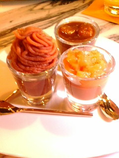 連休は遊び倒れ食い倒れでございました。・初のカイロプラクティック。池袋 ミストモック (西口を出てスグです)お友達が通っているアロマの学校で解剖学の講義をされていた先生が、池袋にて開業されたとのこと。アロマやリフレクソロジーがメインのサロンですが、その先生はカイロを担当されているとか。神がかったテクをお持ちだと聞いて、静岡から来た友人(二度に渡る交通事故で全身が不調)と、15年前に痛めた右肩がカクカク言ってたまに不調なワタクシ早速行って参りました。ふたりで撃沈。効果絶大。終わったときは半分開いた口からタマシイが出そうでした。骨格や筋肉の解剖図を見せながら解説してくださるので、よくわかったような…わかんないような。ふんふん確かにここに筋肉がありますね、とその時は分かったつもりになって張りすぎている筋肉を緩めて頂いても、家に帰って同じところを触ろうとしてもどーしてもわかんない。所詮はシロウト、手の感覚がにぶちんです。今までは整体などに行っても右肩のことは言わずにいたのです。色々と手を尽くして頂いても、夜には痛くなってしまうので。(涙)しかし今回はちょっと違う気がします。さすがゴッドハンド!のっぴきならない状態の方には本気でオススメです!もしご興味を持たれた方には、ここから大事なお知らせです。カイロのコースだけは他のマッサージのコースのような時間制ではなく、自己申告した所を一カ所診るシステムでした。つまり。『右肩』と言えば5分ですが『全身』と言えば1時間です。このルールを知っていればー!(悶絶)・くいだおれピエールエルメでお茶。表参道駅からほんの少し歩いたところ。青山学園の辺りです。ショコラ三点セット。マロン、ローステッドパイナップル、オレンジ+バルサミコ。それぞれ単品でも個性的で楽しいのに、食べ合わせによって無限に楽しい…!悦楽の領域!(笑)こちらはお友達がオーダーしたヴァニーユ五点セット。エルメ氏のヴァニラ観が凝縮されているらしい。…ヴァニラ観っていったい!とトンデモな語彙に白目をむきましたが、食べてみたら美味さで白目。ちょっと笑っちゃったアタイをぶって頂戴!(笑)マスカルポーネと合わせたムースが天国でした~。うっとり。そのまま渋谷まで歩いて、東急地下の『オリジンーヌ・カカオ』でショコラや焼き菓子、マカロンをお買い物。繊細なショコラなのです。華やかなんだけど楚々とした風味です。帰りに、塩ー!塩気が欲しいー!と地元のチェーン系干物屋へ。〆鯖とほっけに舌鼓。そして野菜をばりばりと。久しぶりのお魚でした。帰宅してから、弟を誘ってテイクアウトしたエルメのケーキやサブレなどなどを食べつつ明け方まで語り。何故かユーロがどうたらとかそんな話題で盛り上がりました。しかし経済学部を出たはずの私が一番わかってないという…。はははっ…。