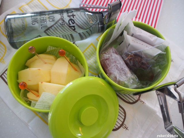 母のところへ行くのに、フルーツやお菓子をお弁当箱に入れて、ピクニック気分で。