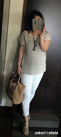 今日届いたばかりのブラウンのサマーニットに去年買ったLAKOLEのブラウンのタンクトップを合わせて。