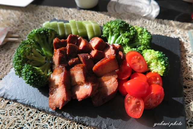 豚の味噌煮とお野菜とフルーツをスレートにのせて。