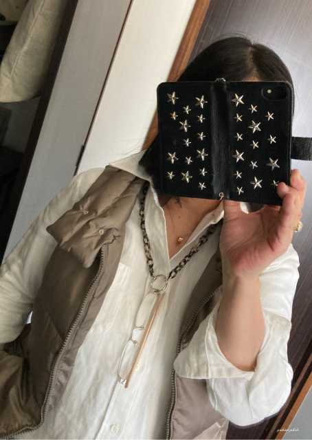 白い厚めのリネンシャツにベージュのダウンベストを合わせました。