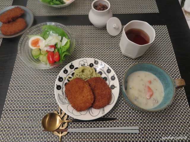 コロッケ、鶏肝、☆ジェノベーゼパスタ、サラダ、ホワイトシチュー