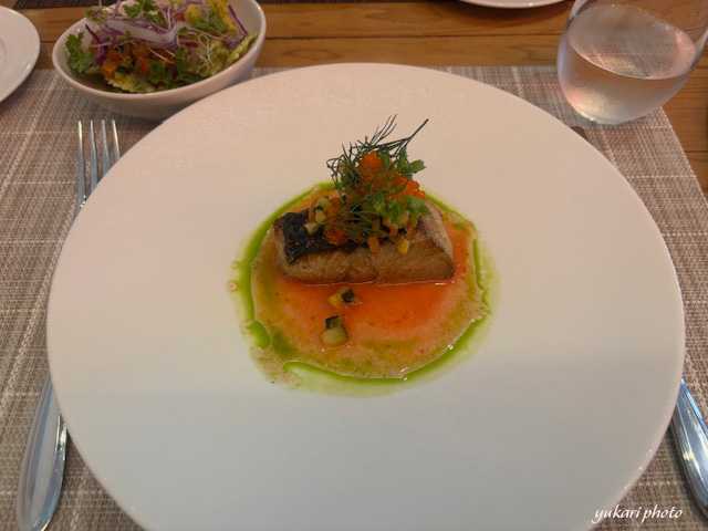 メインは「ぶりのムニエル 生トマトとバジルソース 冷製おパスタサラダ」にしました。