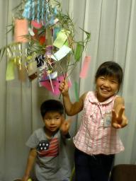 天使達が帰ってきました今日は七夕の笹の飾り付けをするために笹を買い、色紙、のり、ペン、はさみをスタンバイ外である程度遊んでから天使達は製作開始色紙を折ったり、切ったり色々してましたある程度作ったら次は、短冊に願い事を書くようです願い事…秘密ですこれが、飾り終えた笹です完成した笹と天使達の記念撮影どうですかなかなかいいでしょう(えっピンボケでよく分らない)なんだか人数のわりに短冊が多いのは気にしないで下さい願い事がたくさんあるのですみんな、叶うといいな(欲張り)