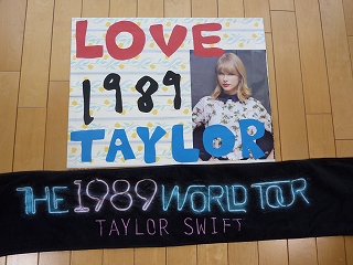 今年の5月休みの大イベントはやっぱりテイラーのコンサートでしたね。初日・・・早くも3時に到着。開場は4時・・・そして開演は6時45分。長い・・・・トイレが近い私にはかなりつらい時間(笑)3時ごろに行ってみるともう入口にはたくさんの人だしテレビ局いくつかいるし。そしてなんといっても若い女の子多い。しかもコスプレやら友達同士一緒のかわいい服装やらいろいろ。コスプレも目立っているけどかなりの人が持っていたのが自分たちで作成したボード。テイラーのコンサートには必需品らしい。電飾使っていたり。目立つようにボードを仕上げてコンサート中に掲げたいんだけど 今回はそれが持ち込んでもいいけどコンサート中は出しちゃダメってことだった。娘も実はコンサート行く前に一人でボード作成していて頑張るなーと思ってみてましたが・・・結局、掲げられないからと持っていかなかった。これが娘の作成したボード。と並んで買ったタオル。早くに開場してみると中では持ってきたボードやら掲げて記念写真撮っている人たち多数でした。娘もそれみて・・・「撮影したかった」とボヤいてた。だからこのブログに載せてみた。。。(笑)みんな見てあげてください♪コンサート内容はとにかく格好良かった。衣装も何着も着てくるんだけど…・スタイル良いから本当に格好良くてすごかったな~また行きたいなーって思いましたよ。