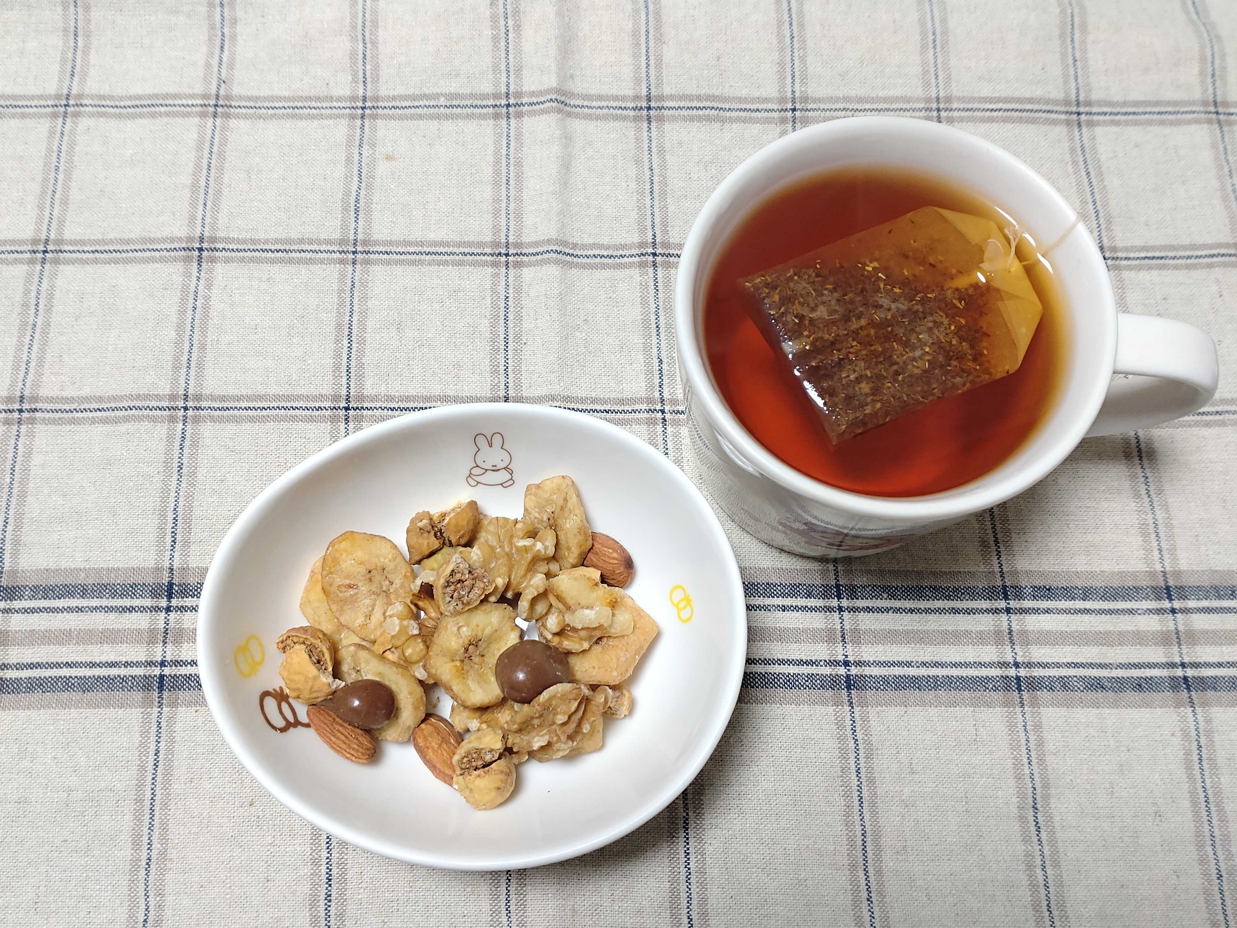朝は残り物のコロッケ昼はいちじくとバナナチップス入りミックスナッツ夜は豚肉の何か
