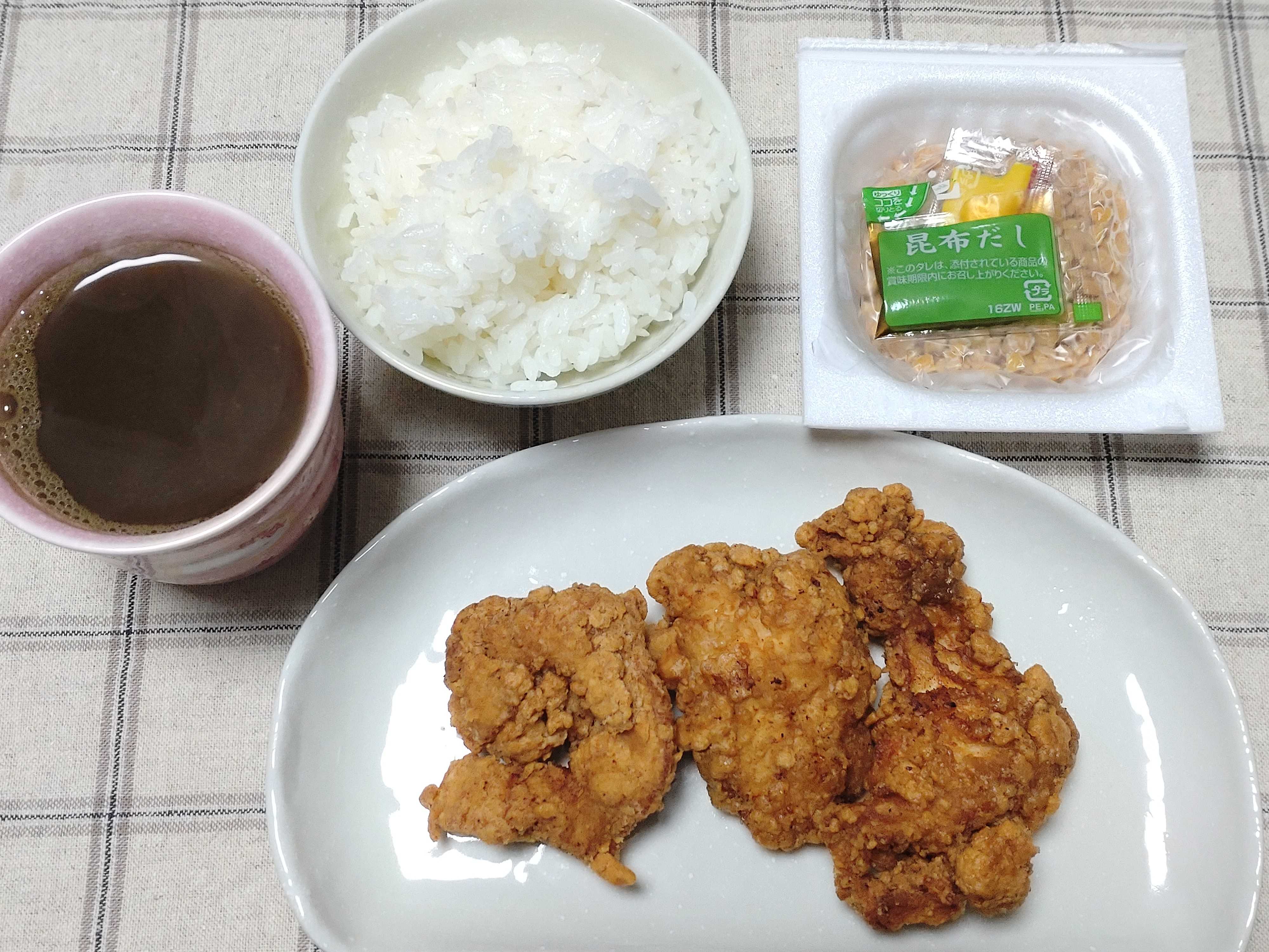 お昼はお漬物とモヤシを味噌であえたヤツ夕食は唐揚げ醤油と酒と生姜で味付け
