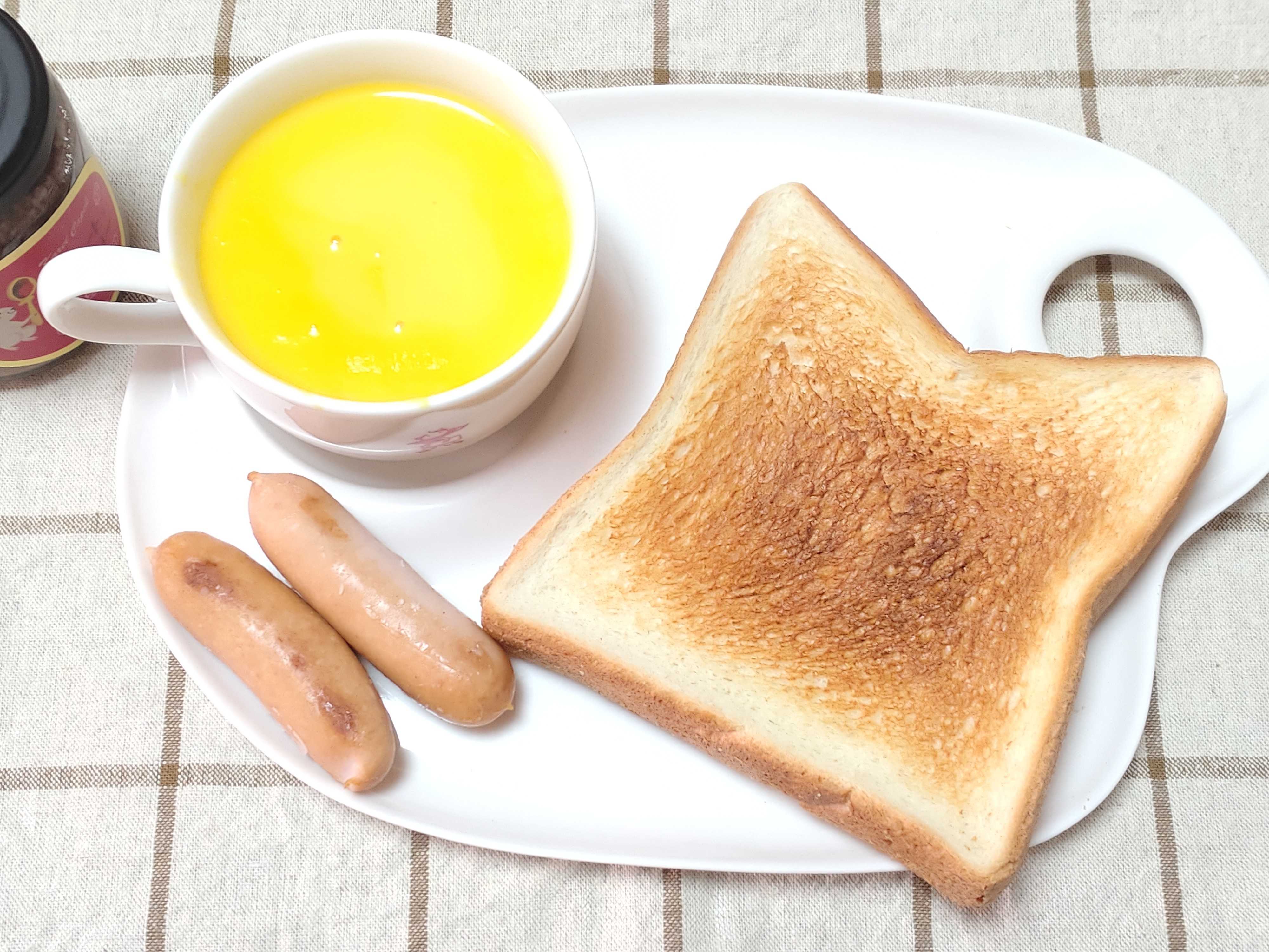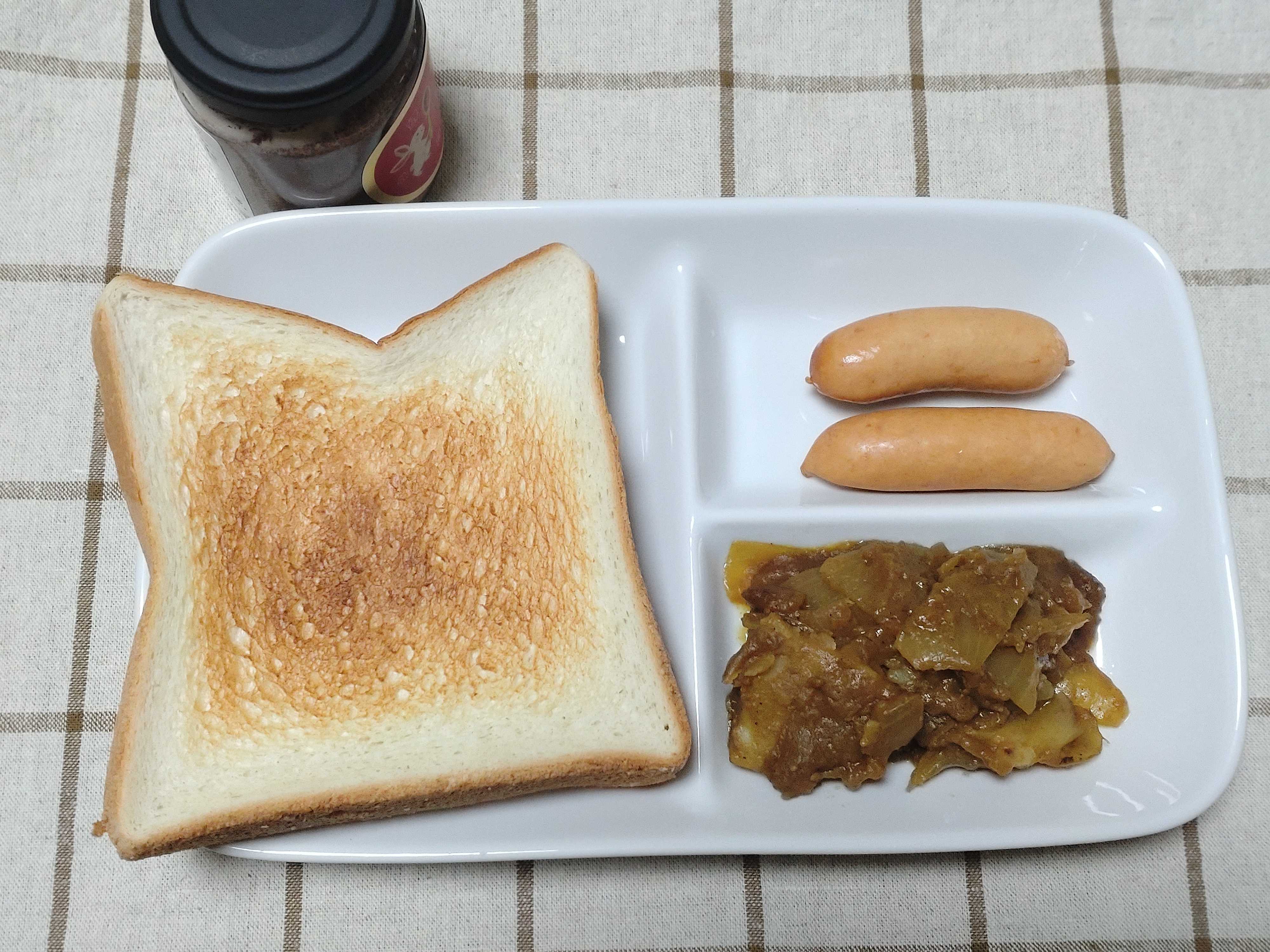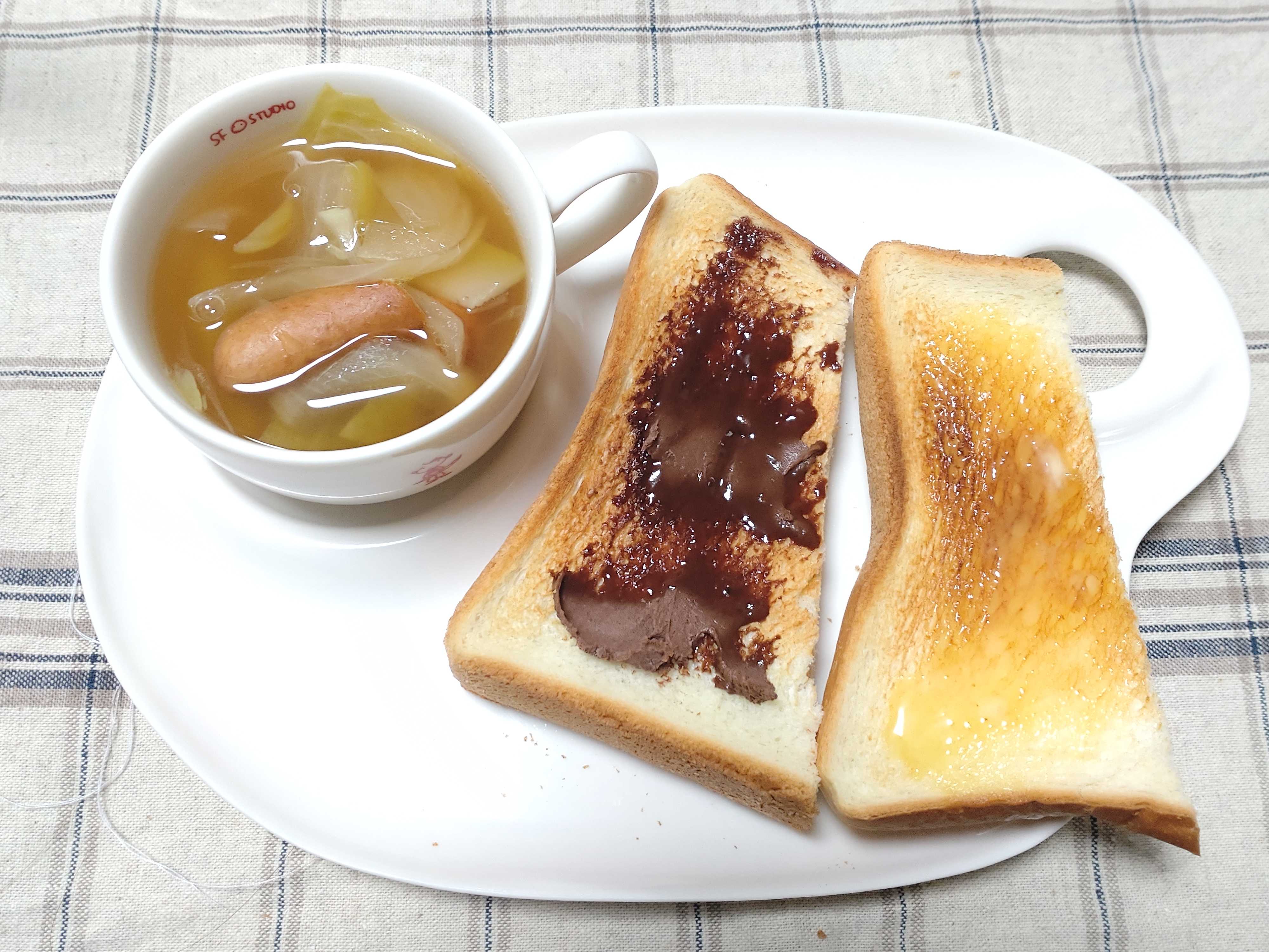 朝食食パン、ソーセージ、パンプキンスープ昼食抜き夕食ナス、厚揚げとしめじ、味噌汁、ごはん