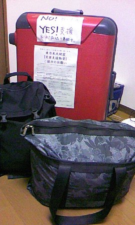 職場で、今日続々と協力のものが集まって全部でスーツケース2個とボストンバッグ、リュックという量になりました!写真に写ってないもう1つのスーツケースは、同じ課のMちゃんが明日車を出してくれるというのでその子が持ち帰ってくれたんです。職場のほかには、マンションの方がお一人、小さなお子さん2人がいるけれどもストックのもので協力を…と提供くださいました。ありがとうございます(;_;)なんだかもう、東京の買い溜めパニックにうんざりしつつあり、こんな大荷物でいると避難か買い溜めと思われ不安を煽るのは超不本意、と思ったので張り紙つき。キャッチコピーは「No!買いだめ Yes!支援」です(笑)ベタですみません…。買いだめに走っているような人にはベタなほうが効きそうですけどね~。明日、車を出してもらうのですがうちのほうまで来ると渋滞に巻き込まれます。貴重なガソリン、貴重な時間を無駄にできないので、Mちゃん家から中野新橋の東京リサイクル運動市民の会の事務所へのルートにある駅まで行くのです。その道すがら、この張り紙が功を奏するかな、と。今買いだめしてる人、意外と短いカップめんの消費期限が来るころ「もう食べるの嫌~」とか言うんだろうな。だって必要な数の何倍も買ってるんだから。明日は団体の人の邪魔にならぬようにがんばってきまーす。力仕事でも何でもござれだぜ~