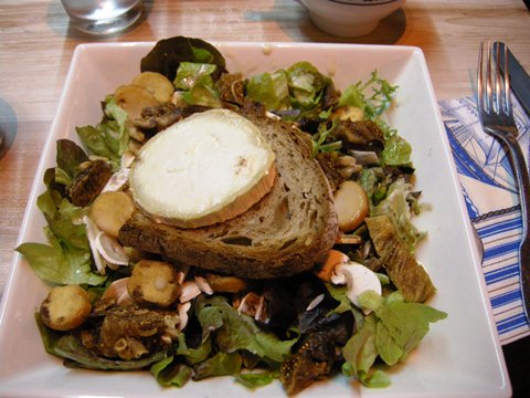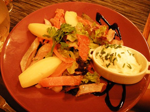 あぁもうなんだか部屋がカオス!とストレスを感じながら遅々として片付けが進まないので現実逃避させていただきます。革バッグのためにTAPIRのワックス探しつつもみつからないのでラナパー注文したりね。いいんだ、これからマメに革靴の手入れしよう、って思ってるから…さぁ。食べ物Anger編の後編ですよ。うふふふふ。夜ご飯は、先輩が寮で一緒のお友達フランス人男子&女子とともにいい感じのお店でちょいと贅沢に。まずは前菜。先輩と私は量を考えて、2人で1皿をシェア。なんしか魚、サーモンともう1種がのっかってます。サーモンじゃないほうが名前わかんないけど、かなり塩気が効いててワインとかに合いそう。バルサミコのソース、うまー!メインには牛肉の赤ワイン煮込み(ブルゴーニュ風)的なもの。全然記憶が定かでないけど、多分そんな感じだったと思う。ほい!ほろりほろりのやわらかーい牛肉ですよ。旨かった…飲めない赤ワインも、MAISON DE VINで働くSちゃんが選んでくれたことだしちょいと飲んでみましたですよ。あぁほんとに私の肝臓がもっと頑張りやさんであれば!!これを頂いたら日本人的にはやはりもうお腹一杯だよね、てことで私は食後は先輩のまねっこでお茶のみ。しかしもちろんフランス人2人はがーっつりとデザートまで食べてましたとも。若いってこともあるのね、きっと。(2人は20代でした)2日目、3日目は引っ越したばかりの先輩のお宅に泊めていただき、朝ごはんは近くのカフェにブーランジェリーで買ったクロワッサンとパン・オ・ショコラを持ち込んでカフェオレとともにいただきました。うひ。フランスってかんじですなぁ。この旅ではカロリー無視!日本ではクロワッサンなんてバターたっぷりだから避けちゃうけど!このカフェはほんとにのドリンクだけ、て感じでパンを持ち込むのは「どうぞどうぞ」という感じだそうで。韓国でも一部、持ち込んで平気なお店があるのと似てるかな。日本ではそういうの、無いですよね。そしてアンジェ市内を観光して、お昼は美術館併設なカフェで野菜ラザニア。7.5ユーロとお手頃価格だけどボリュームは満点~♪これ、珍しくベジタリアン対応だな、と思いました。アメリカとは違って、フランスではあまり『ベジタリアン向け』なメニューは一般的ではない模様。BIOと書かれた、無農薬食材(有機栽培かな)のものはスーパーでもちょこちょこ見ましたし、パリでは専門店らしきお店もみかけましたが。日本もそうだけど、フランスもお肉や乳製品の誘惑が多すぎるもんね…ふふ…マクロビに挫折した身としては、仕方ない!と開き直ってます。ちなみにおやつには、こんな大きなガレットをもしゃもしゃ食べたりも。バター風味が濃厚で、たまらんです!食べ物Angers編はここまで。次は観光編に参ります!