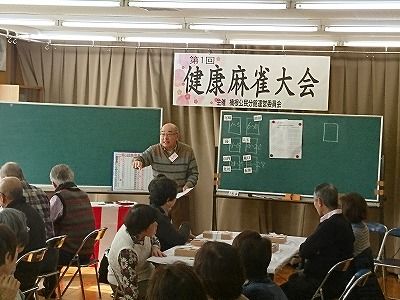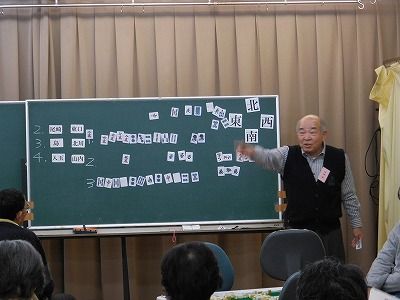 一昨年の9月から始めた公民館の『健康麻雀教室』で記念すべき“第1回健康麻雀大会”を開催。麻雀の『ま』の字も知らなかったまったくの初心者も段々と麻雀の知識が向上し、その成果を発揮する大会です。受講者31名中27名(男性9名、女性18名)が参加。 今日は、“親睦食事会”を兼ねているので、先ずは仕出し専門店から取り寄せた折り詰め弁当で、賑やかな雰囲気で先ずは腹ごしらえ。食後は、6台に分かれてゲーム開始。今回は、初心者もベテランも入り混じっての組み合わせにし、スタッフ(指導者)からのアドバイスを最小限に抑えて進行。皆さんは和気藹々の中にも真剣な顔つきで『ポン』『リーチ』『ロン』。途中で1回、組み合わせを変えて約2時間半のゲームで優勝を争った。上の表の黒字の数字はプラス(浮き)、赤い数字はマイナス(沈み)を表し、トップの栗本さんは1回目がプラス80で、2回目もプラス220でトータルプラス300です。(100点棒まで計算・表記)よって、普通の麻雀で言うところの30000点の浮きです。入賞は優勝、2位、3位、ラッキー7、B.B賞で、今回の上位6名は、殆んど初心者。初心者がベテランに勝てるのが麻雀の面白さです。大会を終えた時の参加者の皆さんは『楽しかった~』『面白かった~~ッ』と全員笑顔。こんなに盛り上がるなら、半年に1回ぐらい大会を開催しようかなと考えています。