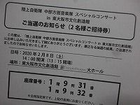 週末は、いつも通り『ピアノレッスン』へ。レッスンの教室へ入るなり先生から『おめでとう御座います』の言葉。が、yukiyukiは何の話か何が目出たいのか分からず、『?、 ?、 !』誕生日の件かな❓ 卓也の受験の件かな❓ それとも・・・❓ よく話を聞けば、当選おめでとう。そう、2月8日の陸上自衛隊 中部方面音楽隊スペシャルコンサートの抽選に当たった事に対するオメデトウでした。抽選に当たった本人(yukiyuki)は、当選通知が来た時には嬉しかったが、「あー 当たったか まぁ良かった」程度。こんなに祝福されるとは思ってもいなかった。そう言えば、将棋仲間の1人も申し込んだが抽選から外れ、一昨日のブログにコメントを書き込んで下さった『永ゆり』さんも残念ながら当たらなかったとの事。実は、yukiyukiは息子の名前と自分の名前で2通ハガキを送り、その内の1枚が当たったのです。今回の抽選の申し込み総数は、ネットで調べても分かりませんでしたが、東大阪文化創造館の座席数は1500席で、1人で3名分まで申し込めるので単純に計算して500名が当たったことになります。それにしても、自分が当たったこともだが、このコンサートの人気の高さに大変驚いています。さて、肝心のピアノレッスンは、両足でのペダル操作に苦戦して、足の動きも指の動きもバラバラで、頭の中はパニック状態が続いている。「練習あるのみです」