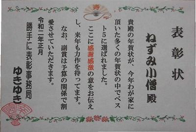yukiyukiが独断と偏見で選ぶ、“我が家に届いた年賀状”のベスト5枚が決定し、19日の抽選日に間に合うように、今日、『表彰状』発送を済ませました。今年届いた年賀状は81枚。(喪中はがきは5枚)相手さんの顔を思い出しながら1枚1枚見て行くと、届いた子(ね、鼡)のイラストは68匹、孫や子供或いは自分の写真を使っているのが6枚だった。いよいよベスト5の発表です。 来年は、どんな力作が届くか楽しみで~す。最後になりましたが、今年、年賀状を頂戴した皆さんに「ありがとう」 【追記】今日の『投げ放題』の結果。スコアーは低迷中。