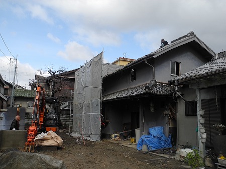 春分の日を目前に、冷たい風が吹き気温がグッと下がり1日中寒い日となった。関西だけでなく首都圏でも気温が下がり、東京に大雪警報が出て、雪が激しく降り交通事故が多発したらしい。そんな中、半日型フィットネス デイサービスでビーナスへ。先週は用事のためにお休みしたので2週間ぶり。今日も前向きに身体を動かしたが、身体が固くなっており、無理をしない程度で身体を解(ほぐ)してきた。もちろん、おやつのバナナと菓子パンを持って。寒さの影響で帰宅後も身体が重く、動き回る気がしないので在宅で横になって高校野球、大相撲、続いて大リーグの大谷選手の活躍をテレビ観戦して過ごした。さて、上の写真は、今日の自宅の様子で、昨日の内に建物の周りに足場が組まれ、防音・防塵シートでスッポリ覆われた状態。うえの写真は、平屋の建物以外の取壊し工事が全て終わった15日の状態。 別の角度から空地になった所は、工務店の手で杭を打ち、ロープを張っ貰った。築70年近くの平屋の建物もあちこち傷んでおり、屋根や外壁の補修工事がこれから始まる。と同時に、屋内のトイレの改造と小さな台所の新設工事が進んでいる。それにしても寒い~~~~~っ