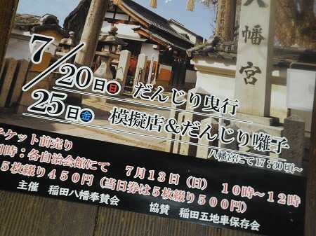 今日は、『津波 』『酷暑』『ビーナス』で1日が暮れた。先ずは、津波。どのチャンネルも終日、津波、津波、逃げて、逃げてばっかり結果的には日本では大きな被害が出なかったが、ちょっとマスコミ各社は大騒ぎし過ぎと違うかな。こんな時は、NHK一本で詳しく集中的に報道すれば良いのではなかろうかちょっと不謹慎かもしれないが、この報道状態に『うんざり』。次は酷暑。クーラーを良く効かせて、寝るしかありません。ため息も出ません。午前中は半日型フィットネス デイサービスでビーナスクラブへ。ビーナスクラブの壁面に貼ってあったポスター。徳庵祭りと書いてあるが、正しくは徳庵住吉祭り。昔からビーナスクラブの前の徳庵商店街に多くの露天商が出て、多くの人出で大混雑するので午後は休業するらしい。大阪の夏祭りは愛染祭で始まり,住吉祭(7月30,31日)で終るといわれている。そんなこんなで、良いのか悪いのか分からないが、今日は石破さんの影が薄かった。