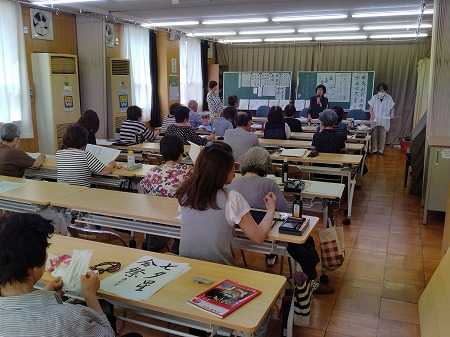 月に1回の公民館の『書道教室』。新年度が始まって4回目の授業で、例年、この頃になると欠席者が段々と多くなるのだが、今年の受講生の皆さんは熱心で、上の写真のように空席が少なくお稽古に励んでいます。みよし野の 山の秋風 さよふけて ふる里さむく 衣うつなり (参議雅経)(大意)吉野の山の秋風が吹きおろし、夜も更けて、かつて都であった吉野の里は、寒々として衣を打つ砧(きぬた)の音が聞こえてくることよ。日頃殆ど筆を持つことが無くなったyukiyukiは、何回稽古しても伸びやかな文字を書けずに悪戦苦闘。でも、クーラーの良く効いた会議室で静かに筆を運ぶひと時はyukiyukiにとって貴重。いつもの様に講師の神原先生の色紙を紹介します。 。 。 。 。 。 。 。 。