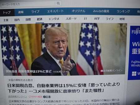今日のキーワードは、15%!?日米関税交渉の合意がトランプ大統領の発表で明らかになった23日、25%とされていたアメリカ向けの輸出に対しての「相互関税」が15%に引き下げられる内容に安堵が広がったとの報道。yukiyukiの知識では、関税とは、海外から商品を輸入する際に国が課す税金のことです。関税は各国に大きな影響を与え、さまざまな業界の国際取引に影響を及ぼす。もちろん税金は高いより安いほうが良いのは分かっているが、相互関税がどうのこうのと言っても、これがどれ程大きな意味を持っているかは、漠然と分かる程度で、ハッキリ理解できない。トランプの気儘な政策によって、世界の経済が振り回されて、日本を含む世界各国はドタバタ状態が続いている。物事には、必ず表と裏があり、今回の交渉でも色んな裏取引がありそうで、15%に下がった下がったと喜んでばかりでは無さそうですね。自動車やトラック、コメやその他特定の農産物の市場を日本が開放したり、日本に対する防衛費の増額要求が見え隠れしている。いずれにしても、暗礁に乗り上げたかにみえた日米関税交渉が、一転して合意に至る急展開をみせた。日本経済への悪影響は一定程度抑えられることになったが、果たして、この先、どうなるのかさて、午前中は半日型フィットネス デイサービスで、いつもの様にバナナ1本とワッフルを小袋に入れて持参し、10時半過ぎに別室で1人空腹を満たし、器具を使って積極的に身体を解(ほぐ)してきた。