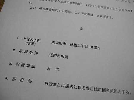 ​​​​​目的は、道路反射鏡すなわち カーブミラー 設置同意 に関する件。