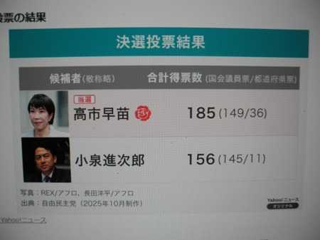 ここ暫くテレビでは自民党総裁選の話ばっかりで、評論家は小泉がどうの、高市がどうの、林がどうのと好きな事を言ってるし、コメンテーターも分かったような分からないような話に終始で、yukiyukiは、そんな番組を極力避けてチャンネルを操作。今日の総裁選では1回目の投票で1位だった高市早苗・前経済安保担当相が決選投票でも小泉進次郎農林水産相を上回り、新総裁に選出。高市陣営の議員は、「大逆転だった」と評価し、小泉陣営の議員からは、「想定外に議員票が伸び悩んだ」と振り返った。この選挙期間中、麻生最高顧問が久しぶりに顔を出し、この選挙結果に影響を与えたらしい。麻生氏の顔をテレビで見て、『あれっ 麻生さんは、まだ引退してなく現職で最高顧問のままだったのか』とyukiyukiは驚いた。このまま行けば、国会の首相指名選挙で、日本初の女性首相に選ばれる公算が大きいが、野党との連立や党内人事で色んな問題が出て、苦労するやろな~~。なったらなったで、今は、国内だけでなく各国との外交にも多くの問題が山積しているので、この先、イバラの道になりそうで、もしかしたら高市内閣の寿命は短いかもしれませんね。果たしてどうなることやら yukiyukiは高市氏への支持、不支持のどちらでも無いが、彼女が話の途中で時折見せる笑顔が、あまり好きでなく、作り笑顔のように不自然に感じる。yukiyukiが好きであろうが好きでなかろうが、取り敢えず、色んな面で低迷するこの日本を少しでも前へ進めてくれるように願うのみです。