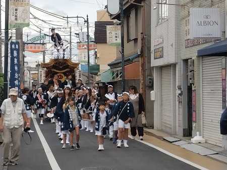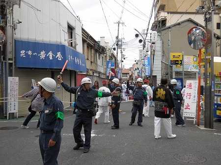 今日は朝から曇天で、ハッキリしない天候の中、秋祭り2日目。朝から制服に着替え、体調を整えながら昼まで自宅で待機。昼食を軽めにとって13時からのJR徳庵駅までの5台のダンジリのパレードの交通整理のために午後0時半に現場へ。今年は、今津の祭り(比枝神社)と同じ日で徳庵駅前で今津のだんじりと出会い。交通量の多い商店街を車の通行止めをするために、防犯委員さんの配置を決め、地車保存会の関係者と連絡を取りながらスムーズにパレードを終えたのを見定めて、一旦帰宅。責任感の緊張で身体・足の疲れを感じないが、帰宅後は念のためにベッドの上に身体を横たえて体力を温存。19時からは、秋祭りのメインイベント・稲田商店街パレードを控えているので、夕食を軽く摂って、18時半に現場へ出掛け、多くの見物人と通行する車の事故の無いように、万全の態勢を取って、防犯徳庵支部の委員さんとも協力して交通整理に当たった。5台のだんじりが集まって、いよいよ賑やかな商店街パレードが始まると直ぐに救急車のサイレンの音が聞こえ、救急車を優先して商店街の中まで誘導。最初は何があったのか全く理解できずビックリしたが、商店街の近くに住んでおられる方が、家族に病人が出たので救急車を呼んだとの事で、パレードを一旦止めて、病人さんを運び出すまで待ってパレード再開。こんな事は全く初めての経験だ。この賑やかなパレードは20時に幕を閉じたが、そのころから生憎と雨が降り出し、少し雨に濡れながら交通整理に当たり、20時40分に帰宅。昨晩も20時15分ごろから雨が降り出し、今年の秋祭りは、雨に祟(たた)られる秋祭りとなった。天候には恵まれなかったが、この2日間、事故、トラブルが無く、無事に秋祭りの行事を乗り切り、ホッと肩の荷を下ろしています。 明日も何やかんやと忙しくなりそう。