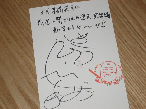 吉本興業の芸人さんから年賀状がもらえるっていうキャンペーンがあって辻本茂雄さんが旦那も息子もうちもすきなんで1枚だけ応募してみた。1人の芸人さんから抽選で10名がもらえるんだけど「あれ、当たらんかったなー」とかいって忘れたころに届きましたーーーーー。うれしーー3月もちろん行きますとも♪いやー。こういうの当たったのって初めて♪
