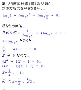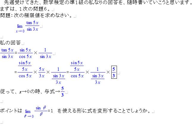 今日(4月15日)、生まれて初めて数学検定を受けた。数学には自信があったので、いきなり、準1級を受験した。 感想は、楽しかった。簡単ではなかったが、久しぶりに頭をひねって考えるというか、真剣に物事を考える楽しみを味わった。高校3年間(といっても、私の場合20年以上前の話になるが)で学習することに大学初年度の半年くらいの初歩知識を問うくらいのレベルかと思う。たぶん合格できたと思う。 で、以下は、私なりの問題解説。1次:問題1文字を含む分数式の除法の問題。いきなり割り算をやる前に、因数分解すると、簡単に約分できる。1次:問題22を底とするlogXを別の文字Aで置換すると、Aの2次方程式が得られます。後はそれをといて、置換した式をもとにXを求めて終わり。1次:問題3Aの逆行列を求めて、AX=Bの両辺に左からかけて、終わり。1次:問題4(1)|a+b|と|a-b|を各々2乗して、差をとると求めたい内積が見えてきます。(2)(1)の結果を利用するんだけど、図を描くと何をすればいいかがわかります。私はベクトルが形成するひし形の面積からsinθを求め、その後、cosθを求めました。1次:問題5双曲線に関する公式を元に、すぐにできる問題。1次:問題6tan5Xをsin5X/cos5Xに直し、その後、分子を5Xで割り、分母を3Xで割ります。元をとるために、5/3を掛けると、あら不思議、よく知っている極限の式が使えるようになります。1次:問題7部分積分しましょう。2次はやった問題だけ解説します。2次:問題3Aに逆行列が存在しないことが必要条件になることはすぐにわかる。その条件下で、零行列でないXが存在することを、例をあげて説明しました。2次:問題5√2と2の差は2-√2。これを1辺とする正方形を作図し、その対角線の長さを得る。その対角線の長さは2√2-2であるから、この長さを半径として、2を中心に円を描くと2√2の場所がわかる。後は簡単だよね。2次:問題6n=1,2,3,4くらいまで、実際に計算すると。和の式が推定できます(簡単)。後はそれを数学的帰納法で証明して終わり。2次:問題7(1)「tとhの関係式を求めなさい。」と書いてあるので、別にtをhの関数であらわしてもいい訳です。hをtの関数であらわそうなんて考えると、たぶん、ドツボにはまる。(2)(1)の結果から、ポイントになる点を決めて、3次曲線が90度回転したグラフを描く。