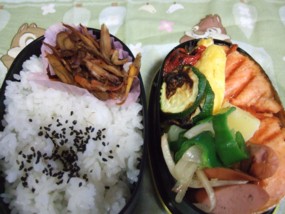朝から大雨で、ぼーっと外を眺めていたら・・・・・じかんがぁ~大慌てでなんとか作りました。 鮭チーズ入りオムレツズッキーニとミニトマト オーブン焼き(焼くだけ^^;)ウインナー・ピーマン・玉ねぎ炒めもの(オリーブオイル)ムスコと父さんは、コロッケを入れました。2個しか揚げなかったので、私は粉ふきイモ (*゜.゜)ゞポリポリご飯の上には、キンピラゴボウと黒ゴマふりかけ