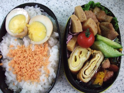 ムスコが私立の中学へ通い始め、朝もはよからお弁当作りに明け暮れています(^^ゞ最近は、父も持っていきます。3人同じメニューのお昼ごはん。ちょっと、幸せを感じます (^_^)v今日は、ハハのお弁当。前日に煮ておいた、豚バラ肉の甘辛煮かぼちゃとニンジンソーセージのオリーブオイル炒め筍のおかか煮(なぜか食べたくなって、お惣菜パックです (^^ゞ)卵焼き彩りに ミニトマト・きゅうりご飯の上には煮卵と鮭そぼろ