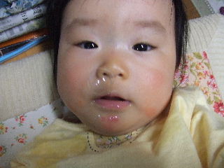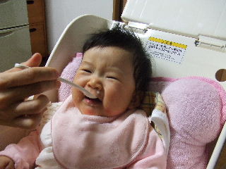 私とだんなが食事をしていると、一緒にお口をモグモグさせてジーッと見ていたので、おかゆあげてみました。スプーンを口に近づけると、自分で口をあけます。でも、実際におかゆを食べるとこんな顔おいしそうには見えませんね(^_^;)