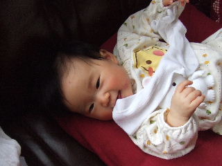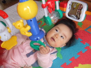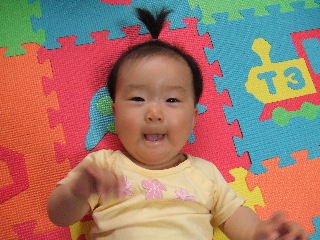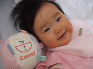 今朝、ベビーベットの中で寝返りをしました。そろそろしそうだな~とは思っていたけど、やっぱり実際にすると感激ですね~。初めてゴロンと回ったのを見た時は、思わず拍手してしまいました。だんなも一緒に見ることができたのでよかったです。今日もミーのおかげで、たくさん笑いましたよぉ。ありがとうね~。