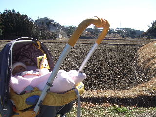 今日はとってもいいお天気でした。はりきってお散歩に行ってきましたよ。お散歩に行くと いつもスヤスヤ眠ってしまう娘ちゃん。今日もそれを期待して出かけました。ところが 今日はいつもと違う・・・。全然寝ないどころか ぐずぐずぐずぐず 機嫌が悪い。仕方がないので 予定より早めに切り上げて帰ってきました。親の思うとおりにはいきませんね~。散歩中。どこの田舎だ・・・
