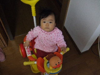7ヶ月のみーたんにはまだ早いかな~と思いつつ、買っちゃいましたちゃんと乗りこなして(?)います今のところ、三輪車に座ったみーたんを私が押すしかし便利ですよ。私がちょっと用事をする間はこれに座って待っててくれるし、トイレに行く時はこれに乗ってついてきてくれますから女の子なのにアンパンマン仕様なのは、家にはってあるコレにくいつきがいいからですそうそう、ショクパンマンの隣の面白い顔の人、なんて名前でしょう?知ってる人いたら、教えてください