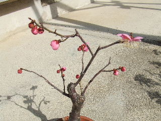 庭の梅も咲きました。こちらは室内のシャコバサボテンそして、お母さんの顔で遊ぶミー