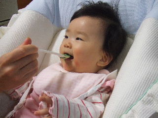 最近、私が離乳食の準備を始めるとウキ~ッと声を出すみーたん食べることがとっても好きらしい今まで食べた野菜&果物は にんじん・じゃがいも かぼちゃ・さつまいも りんご・ばなな・いちご・みかんこれだけ。少ないかな?今日は葉物に挑戦!ということで、ほうれん草いきましたよ~いくら食べるの好き好きみーたんでも、ほうれん草は ベェ~ってするだろうな~と思いながら一口目を食べさせる。んっ??って一瞬固まったけど、お口を開けて催促してるすごぉいみーたんやるね~ 結局、いつもよりたくさん食べたみーたん。明日はブロッコリーに挑戦だ(ブロッコリーって離乳食O.K.だったかな?後で調べなきゃ)遊びに夢中♪