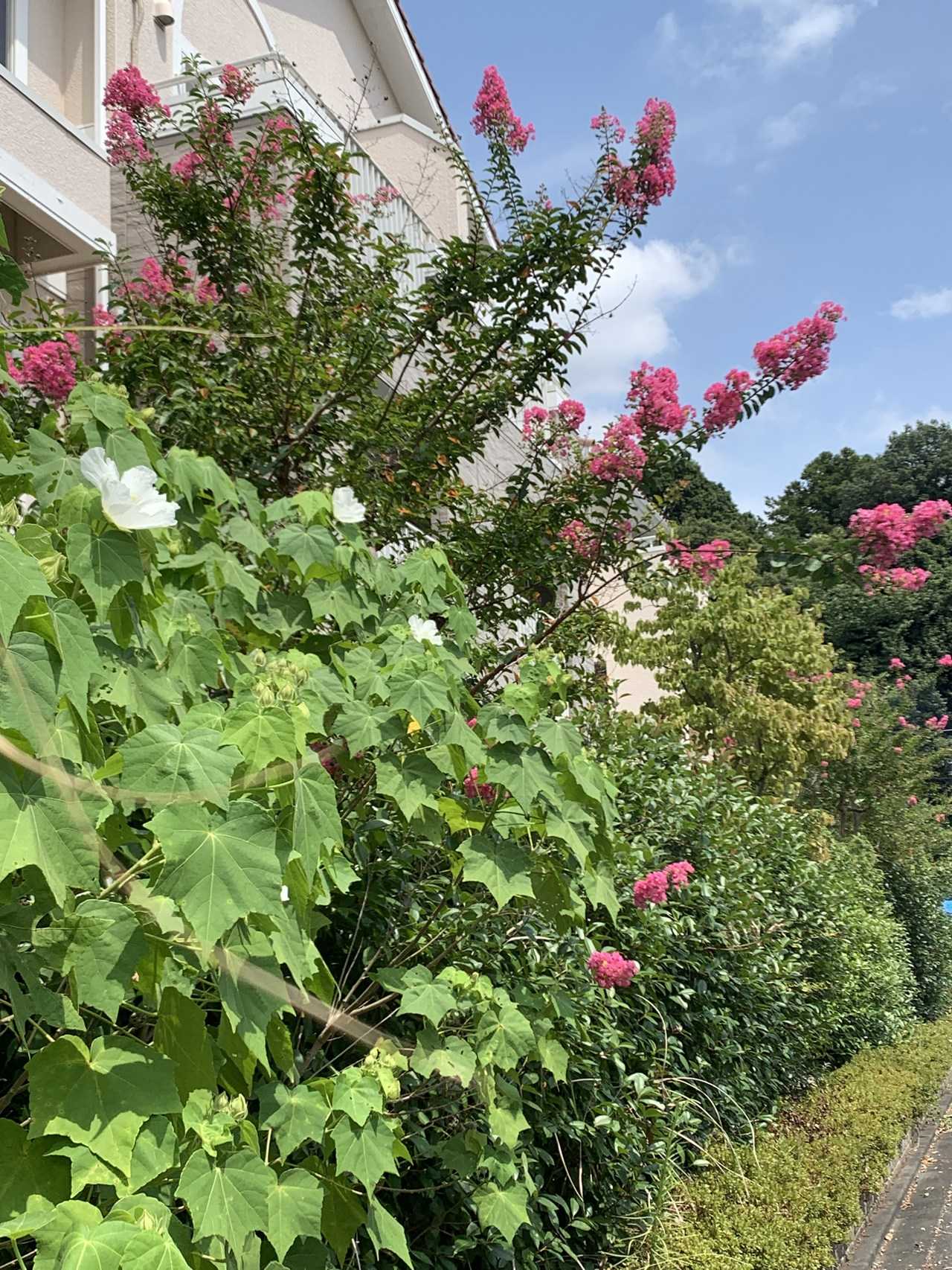 ジェームズオオクボ植物記 処暑の百日紅の赤い花と芙蓉の白い花処暑の百日紅の赤い花と芙蓉の白い花。暦は秋ですが夏らしい暑い日が続いています。ただ、朝夕はだいぶおちついて来ましたね。