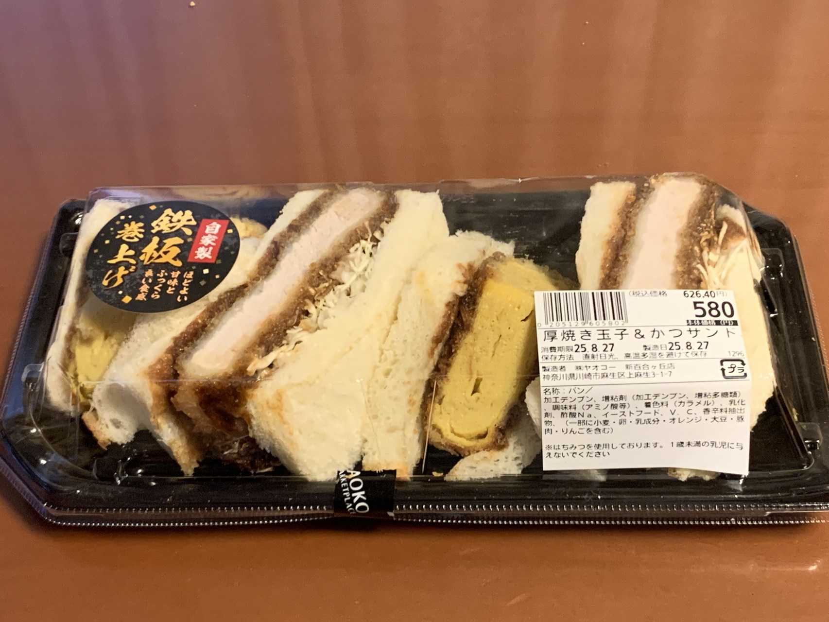 商品研究 「ヤオコー」の「厚焼き玉子&かつサンド」本体価格580円を試食「ヤオコー」の「厚焼き玉子&かつサンド」本体価格580円を試食します。同じ売場にかつサンド3カット入りで同じく本体価格580円で販売していました。厚焼き玉子2カット、かつサンド2カットでコスパ感が良いですね。厚焼き玉子は半分以上の食品スーパーが自家製できないわけだし、差別化になりますね。