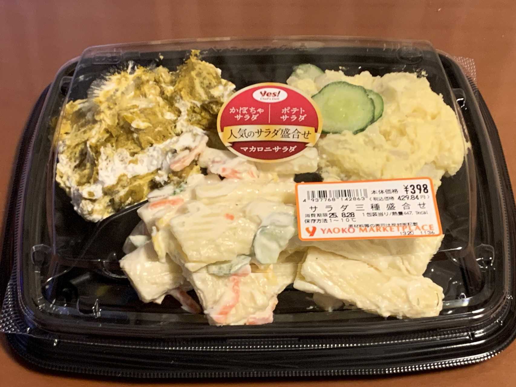 商品研究 「ヤオコー」の「サラダ三種盛合せ」本体価格398円を試食「ヤオコー」の「サラダ三種盛合せ」本体価格398円を試食します。マカロニサラダはマカロニと柔らかく茹でたリガトーニ。マヨネーズはマカロニサラダのイメージと符合する酸っぱさ。ポテトサラダは酸っぱくも、甘くもない印象。最近の若い子がやっている居酒屋のポテトサラダのほうがおいしいな。南瓜サラダは割合と甘さが抑えられている印象でした。