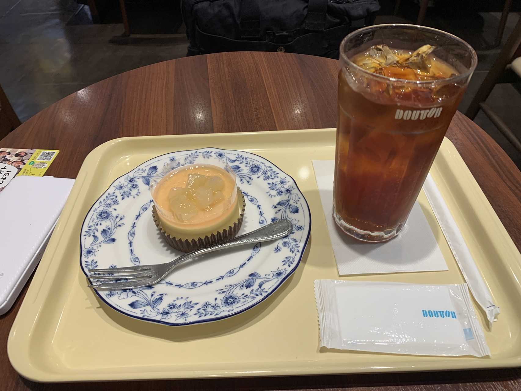 ドトールの白桃レアチーズケーキとアイスティMのセット 今宵は日本料理の勉強なのですが、少し早く着きすぎたので、ドトールでメールチェックして時間調整します。白桃レアチーズケーキとアイスティMのセットです。税込850円。白桃レアチーズケーキは悪くはないですね。アイスティと相性が良いです。