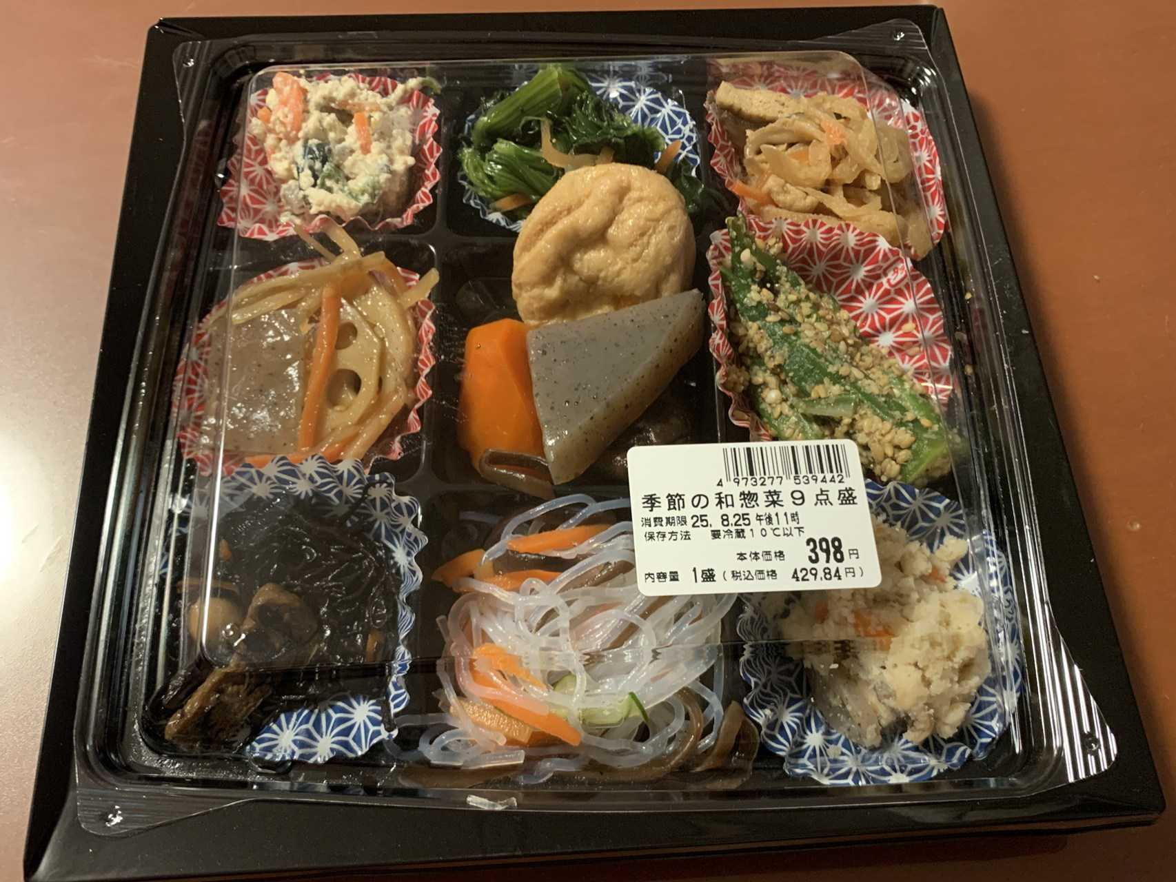 商品研究 「イオンスタイル」の惣菜売場にあった「季節の和惣菜9点盛」本体価格398円を試食「イオンスタイル」の惣菜売場にあった「季節の和惣菜9点盛」本体価格398円を試食します。内容的にはどうってことはないが、本体価格398円というのがなかなか良いと思います。うの花はやや粉ぽく、先日解決したのと同じ問題があるようです。煮物は結構、染みこんだだし感がありました。