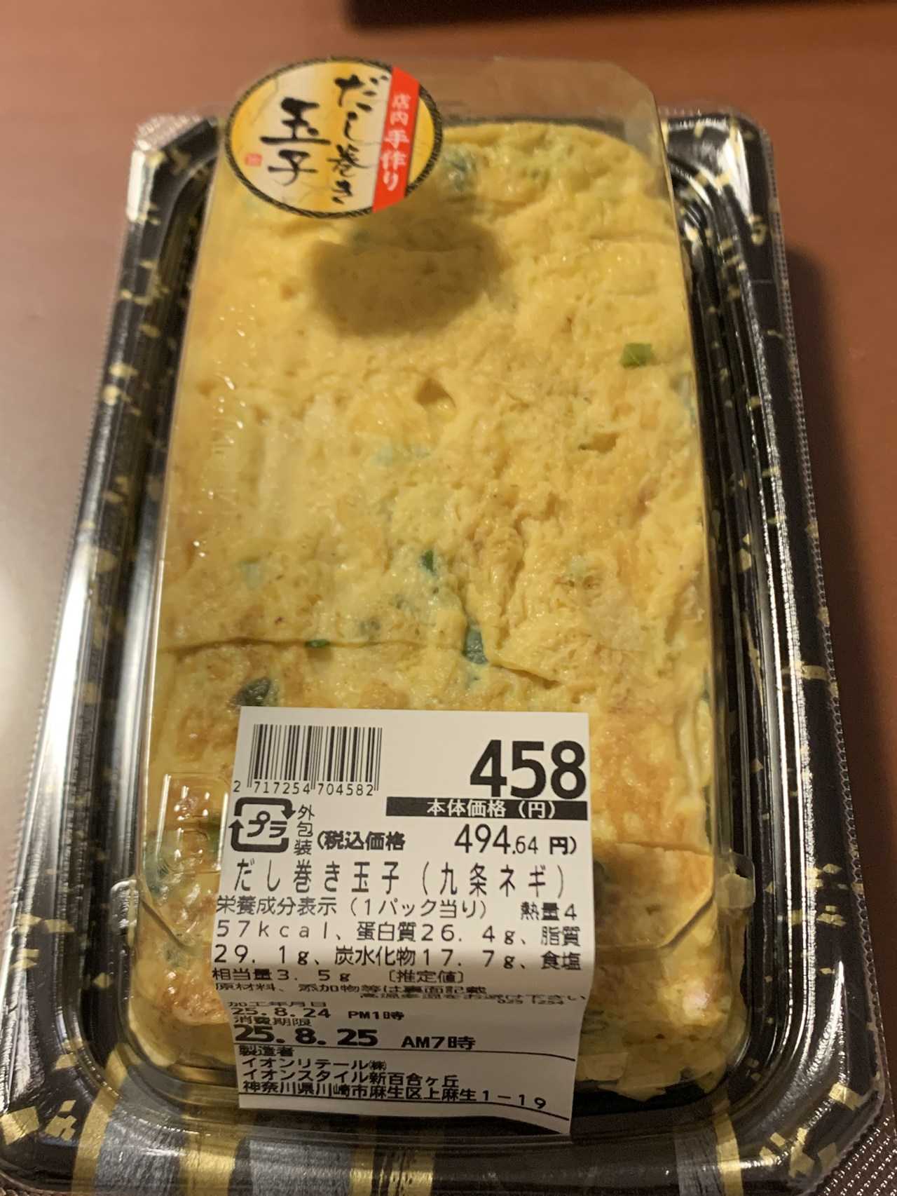 商品研究 「イオンスタイル」の惣菜売場で販売していた「だし巻き玉子(九条ネギ)」本体価格458円を試食「イオンスタイル」の惣菜売場で販売していた「だし巻き玉子(九条ネギ)」本体価格458円を試食します。近くのヤオコーは鉄板で巻上げていますので、そこにぶつけたのかかなり出しを吸わせています。九条葱を入れたのもなかなか良いと思います。だし巻き玉子を並べられるか、並べられないかは大きな駅の食品売場では重要だなと思いました。