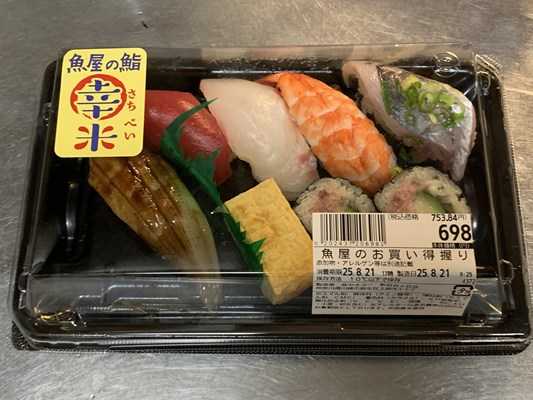 商品研究 「ヤオコー」の鮮魚売場の「魚屋のお買い得握り」本体価格698円を試食「ヤオコー」の鮮魚売場の「魚屋のお買い得握り」本体価格698円を試食します。鮪、真鯛、蒸し海老、真鰺、煮穴子、玉子焼き、トロかっぱ巻き。ゲリラ的にというか気まぐれにというか内容や売価を変えて展開している握りですが、高齢者が多いエリアなので、このくらいのカン数でこれくらいの売価が一番よいのかもれないですね。